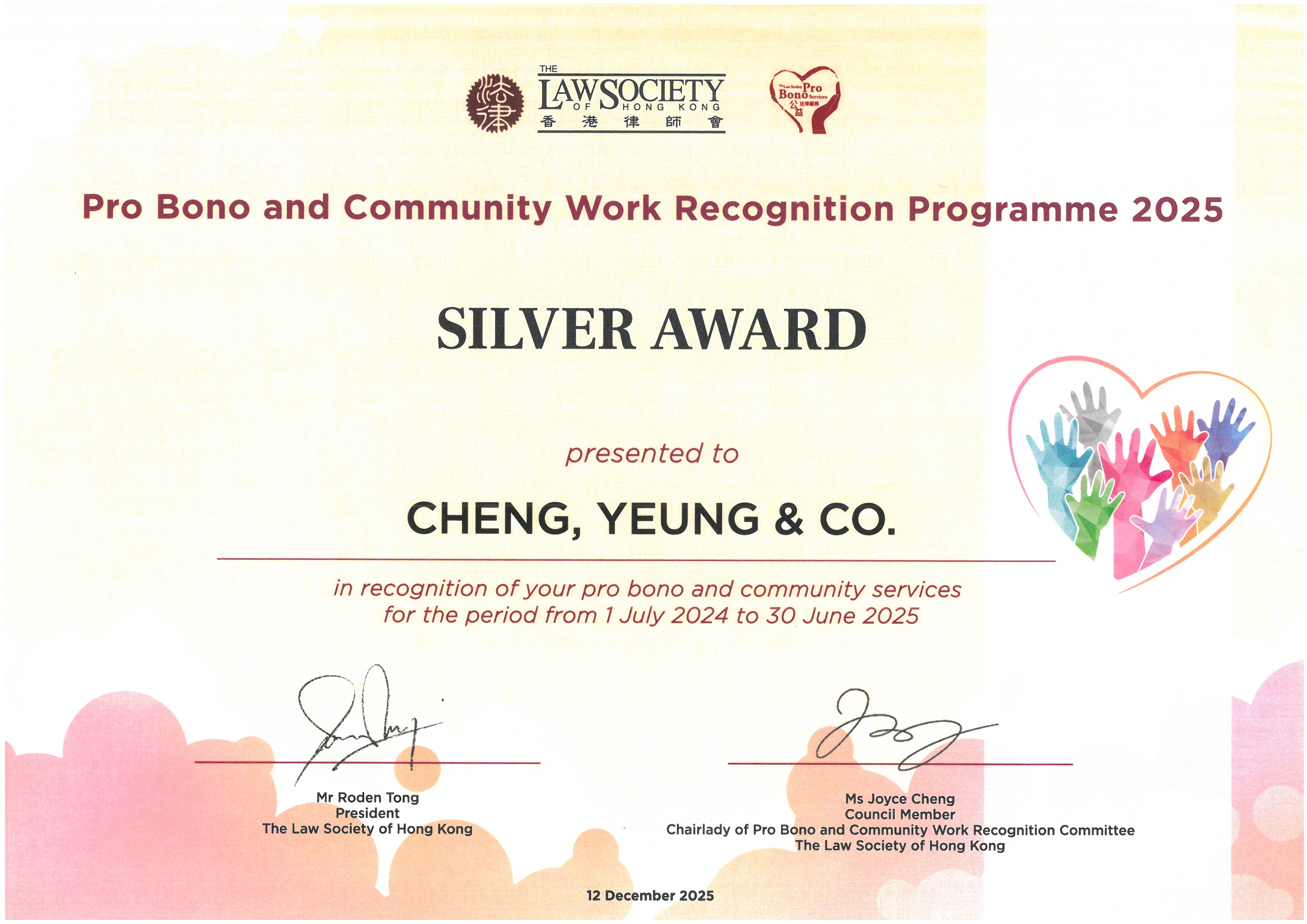 We are proud to announce that Cheng, Yeung & Co. has been honoured with the Law Firm Silver Award under the Pro Bono and Community Work Recognition Programme 2025, organized by The Law Society of Hong Kong.