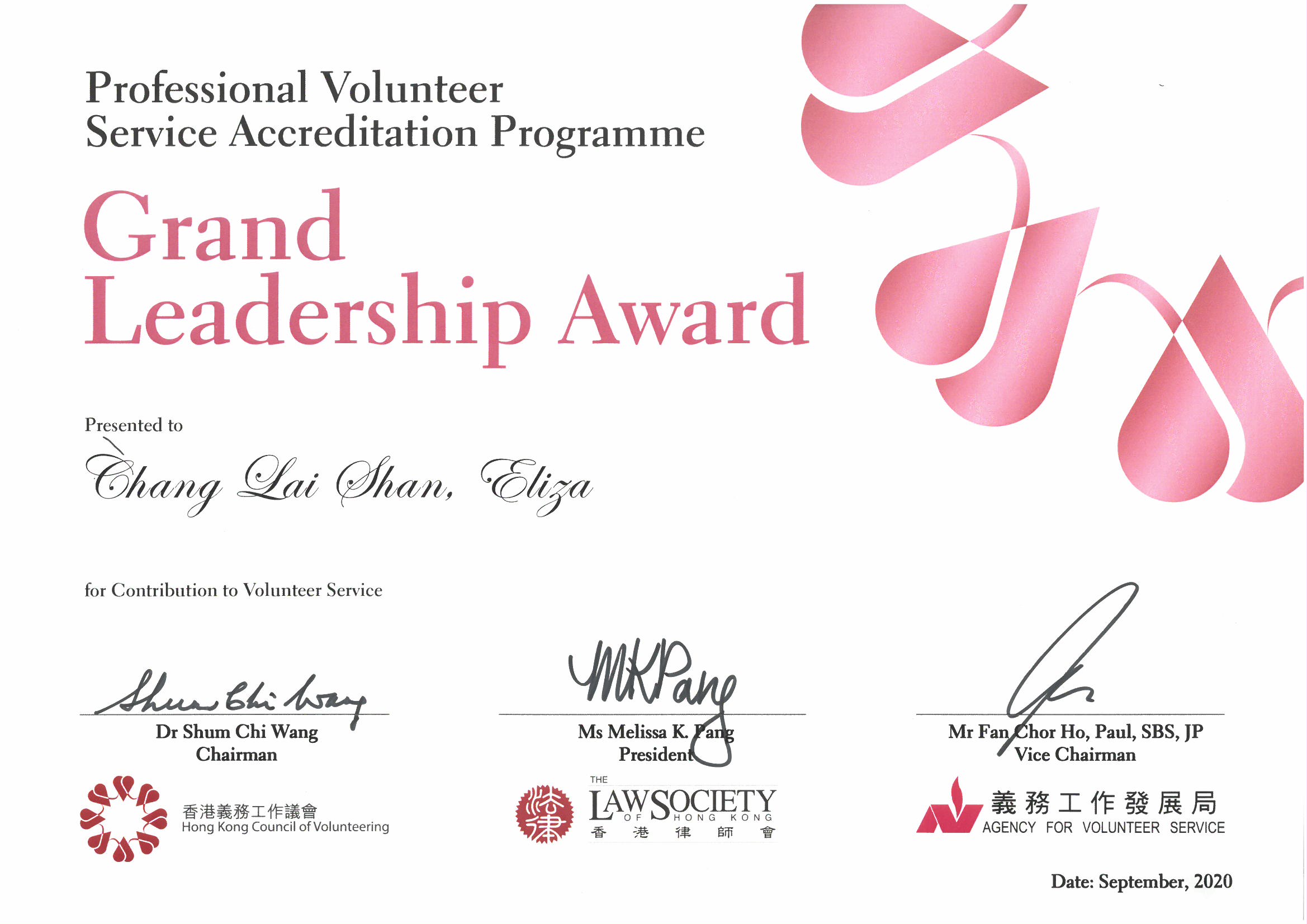 Eliza Chang was awarded “The Grand Leadership Award” under the Professional Volunteer