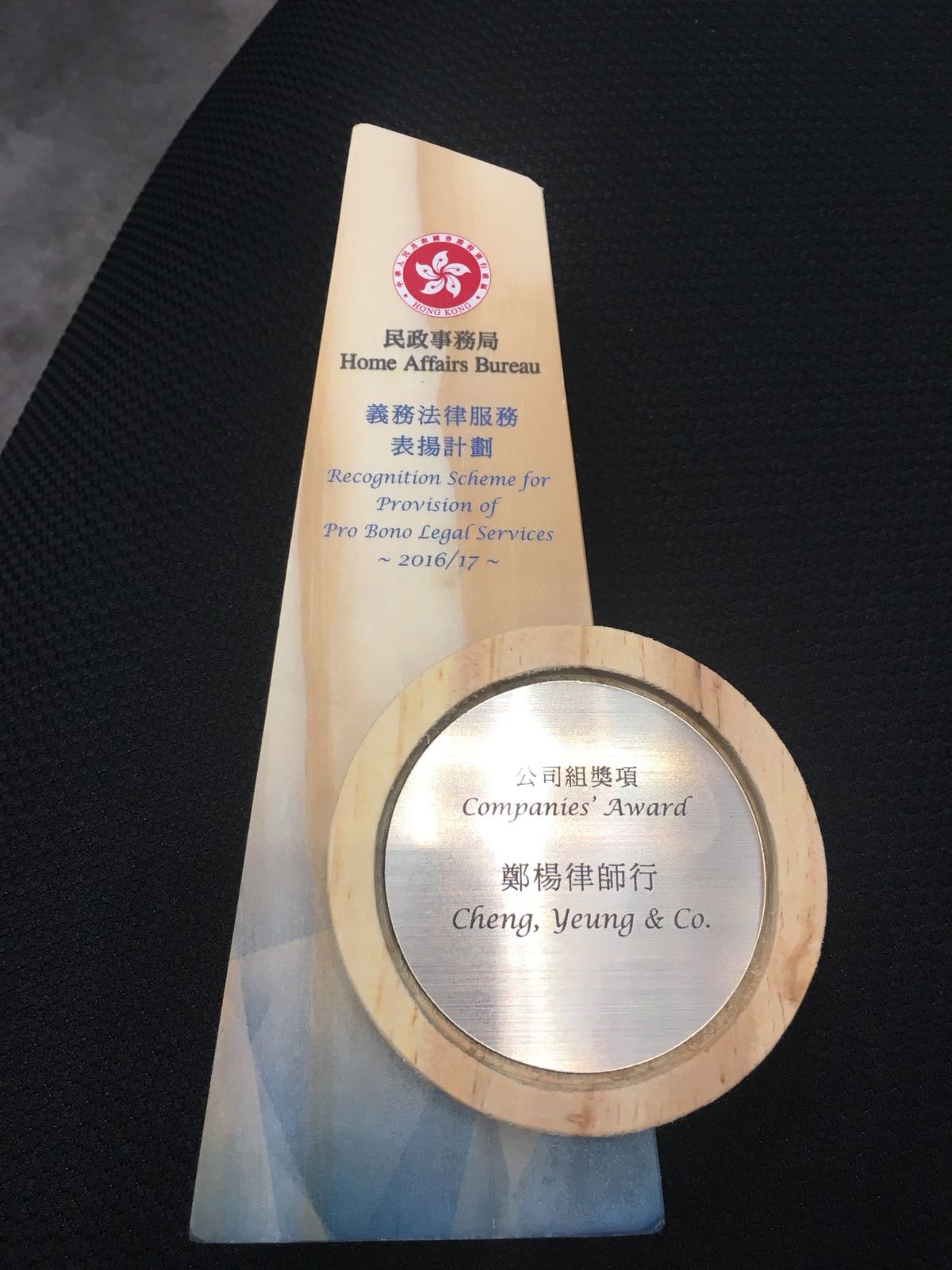 Cheng, Yeung & Co. received awards under Home Affairs Bureau’s Recognition Scheme for Provision of Pro Bono Legal Services 2016/17