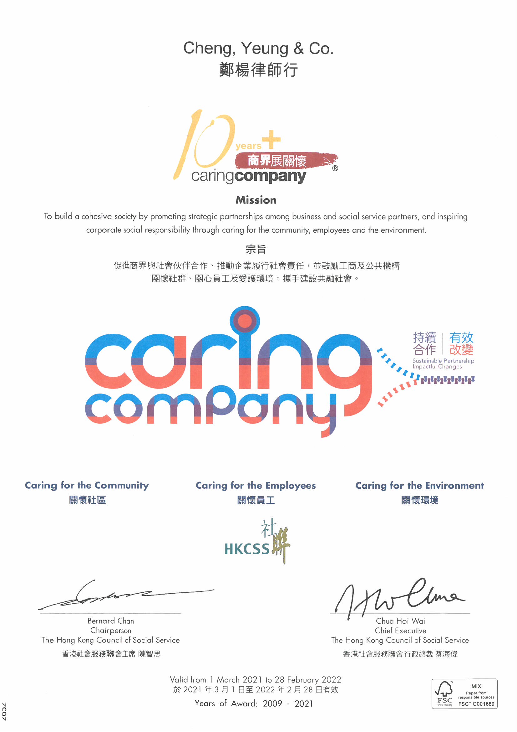 「商界展關懷」計劃的宗旨是促進商界與社會合作、推動企業履行社會責任,並鼓勵工商及公共機構關懷社群、關心員工及愛護環境,攜手建設共融社會。鄭楊律師行過去歷年在建設及促進共融社會的貢獻,致力推廣及提供友善工作環境因而獲得此嘉許。