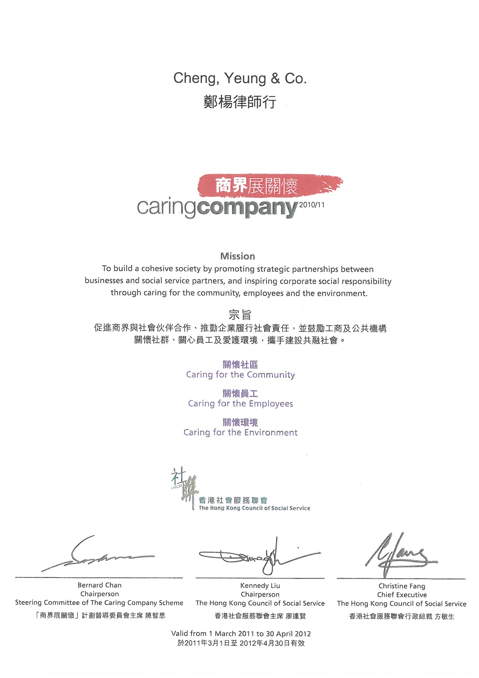 In three consecutive years from 2009 to 2012, Cheng, Yeung & Co. is honored to have been awarded the logo of Caring Company by the Hong Kong Council of Social Service in recognition of the Firm's commitment to caring for the well-being of its staff members, participation in a variety of community services and promotion of environmental protection.
