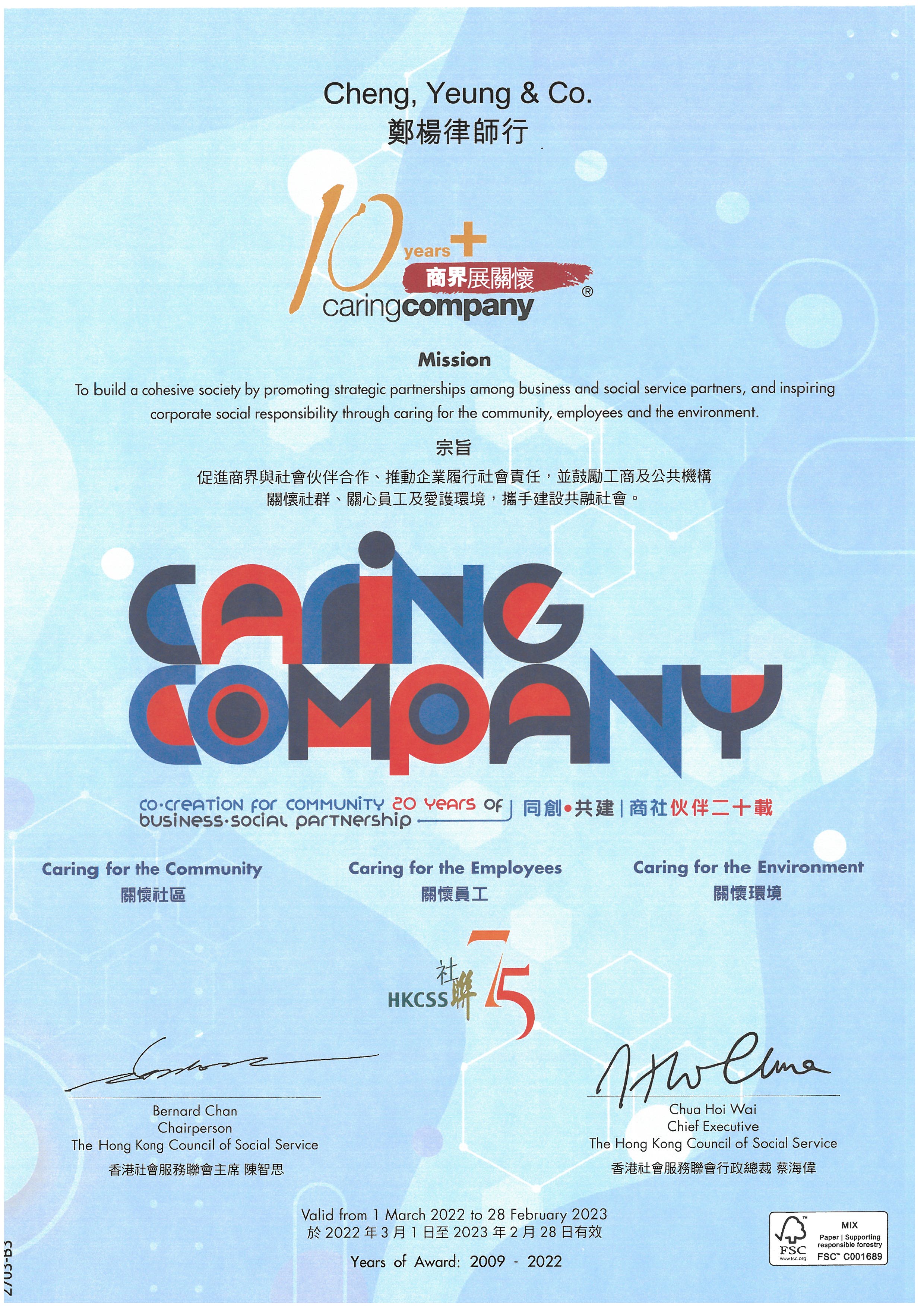 We are proud to announce that Cheng, Yeung & Co. has been conferred the Caring Company Scheme Award for 13 consecutive years. Our Senior Partner Mr. Benny Yeung Yuen Bun, Managing Partners Ms. Ellie Chiu Oi Li and Ms. Eliza Chang Lai Shan are nominated as the Firm’s Caring Ambassadors.