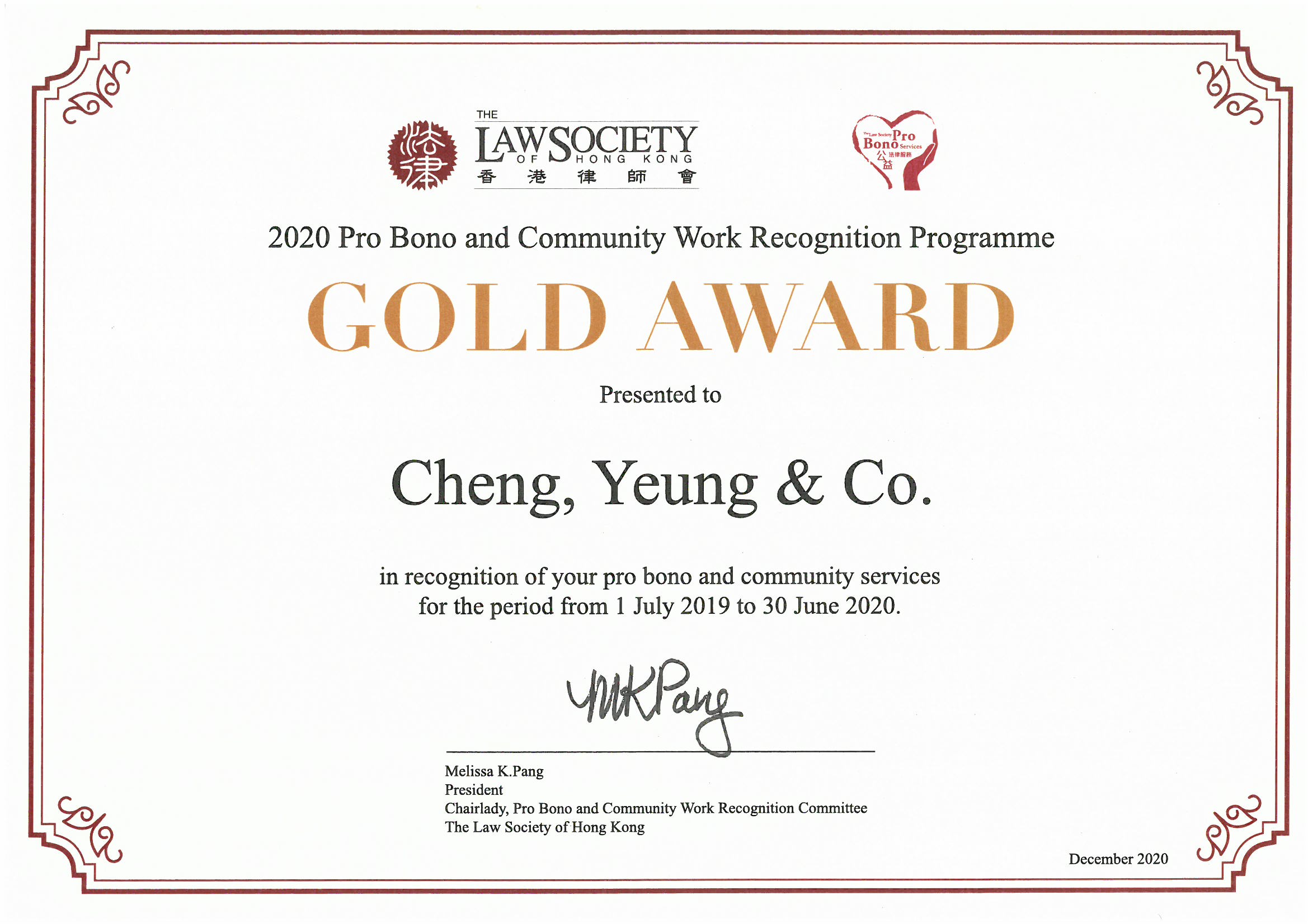 Cheng, Yeung & Co. received the Law Firm Gold Award under the Pro Bono and Community Work Recognition Programme 2020 organized by the Law Society of Hong Kong