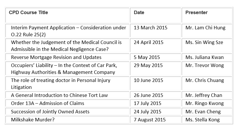 鄭楊律師行於2014/2015年為團隊成員舉辦持續進修和專業發展講座一覽表