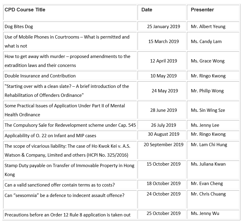 郑杨律师行于2018-2019为团队成员举办持续进修和专业发展讲座一览表
